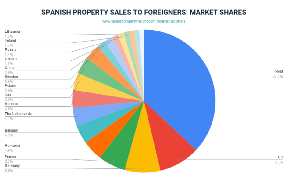 Betrachtet man die Nationalität der ausländischen Käufer, so bilden die Briten mit insgesamt 2.486 Käufen die größte Gruppe, was einem Anteil von 9,3 % am gesamten Auslandsmarkt entspricht. Die zweitgrößte Gruppe bilden die Deutschen mit 2.149 Transaktionen, d.h. 8 % des Auslandmarktes. Die Franzosen bildeten die drittgrößte Gruppe mit 1.660 Transaktionen – 6 % des Auslandmarktes.