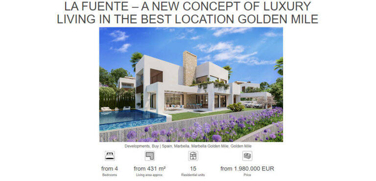 Dem Artikel zufolge befinden sich derzeit die meisten neuen Wohnanlagen in den Gebieten der Peripherie von Marbella im Bau, genauer gesagt im Osten, in den Gebieten Los Monteros und Elviria und im Westen im Gebiet von Nueva Andalucia. Aber im letzten Halbjahr 2020 wurde das jüngste Projekt exklusiv für Engel & Völkers auf den Markt gebracht: La Fuente, eine private Wohnanlage von nur 15 Luxusvillen im Zentrum von Marbella, ganz in der Nähe der Altstadt, des Strandes, der Golden Meile und dem legendären Marbella Club Hotel und bietet dem interessierten Publikum die einmalige Gelegenheit, ein Haus in bester Lage zu erwerben.