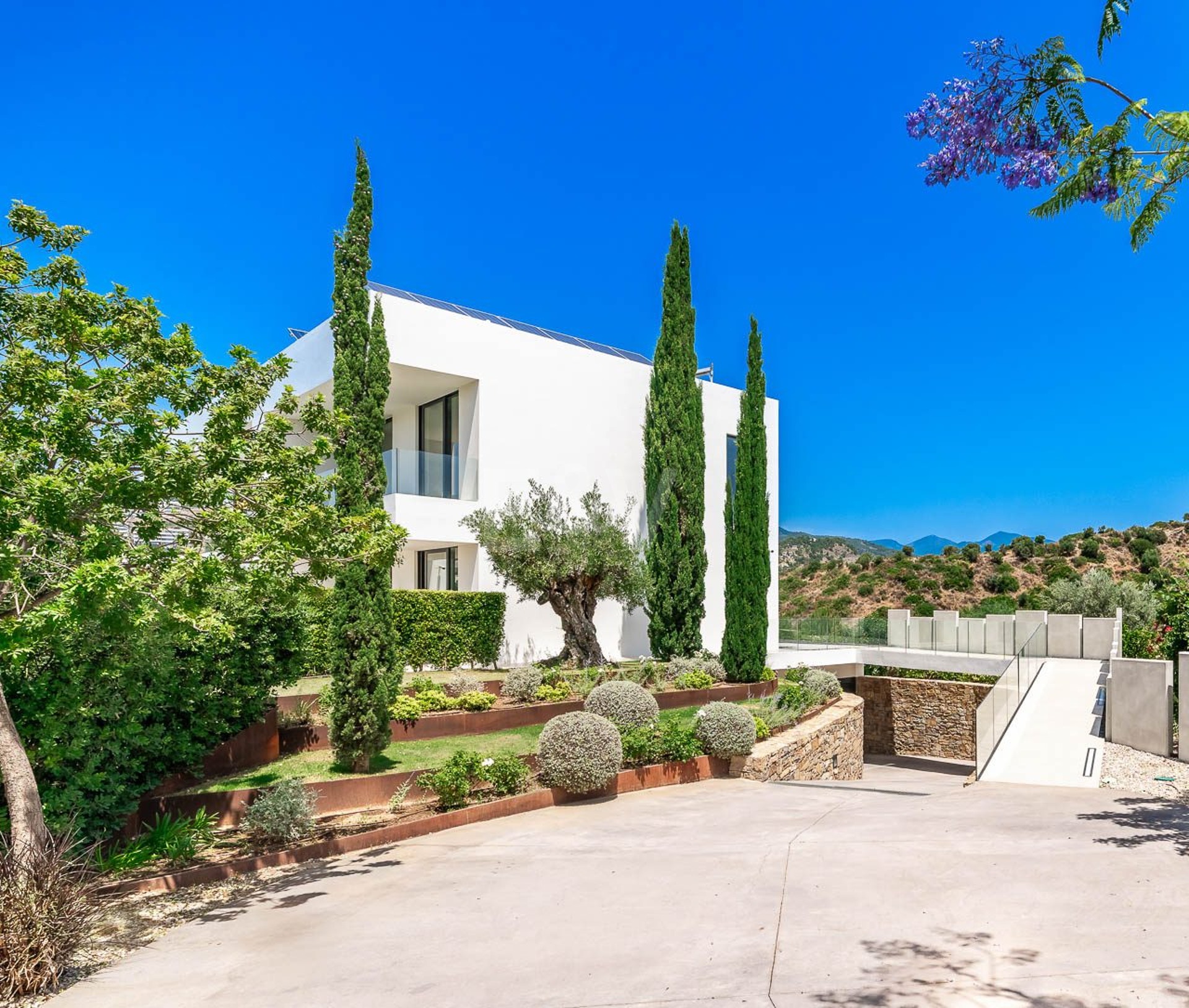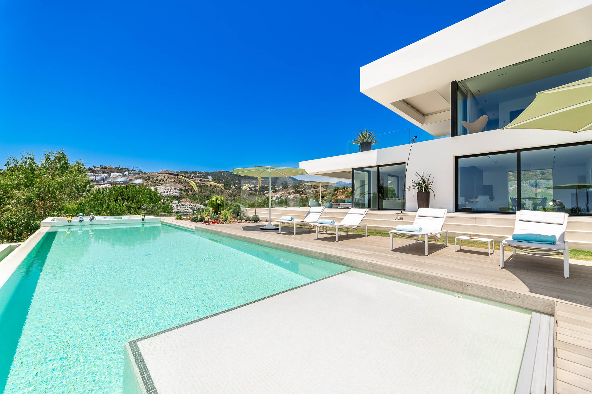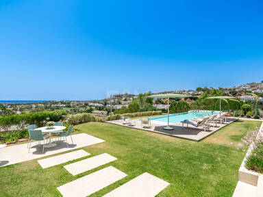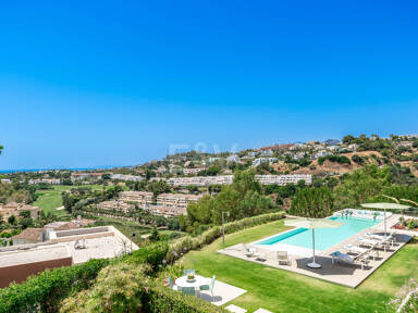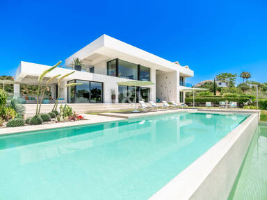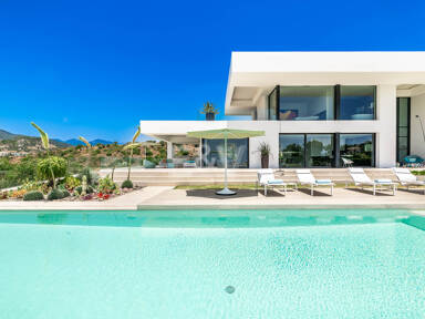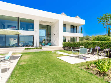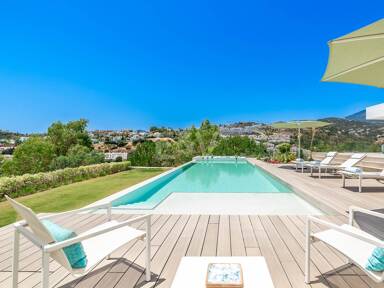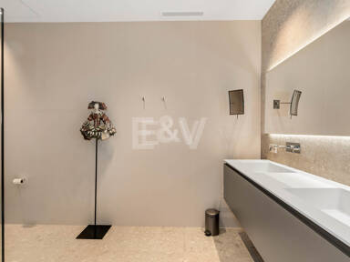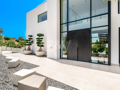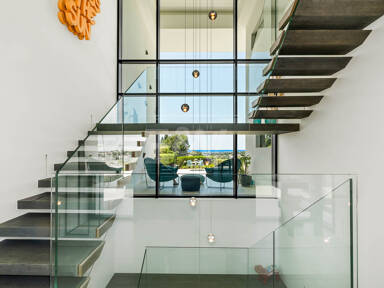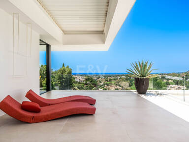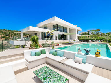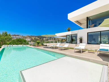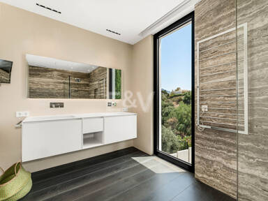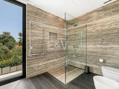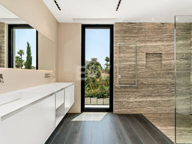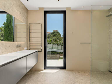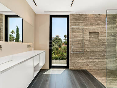La planta superior está reservada para el descanso. La suite principal corona el nivel superior, abrazando la luz y el volumen a través de ventanas de cristal de altura completa que enmarcan vistas ininterrumpidas del valle del golf y la resplandeciente costa más allá. Un refinado vestidor con exposición estilo boutique y estanterías retroiluminadas conduce a un santuario de baño con una bañera independiente perfectamente situada para contemplar el Mediterráneo. Salga a una amplia terraza privada con ducha al aire libre, un oasis bañado por el sol para rituales matutinos tranquilos o el reposo al atardecer.