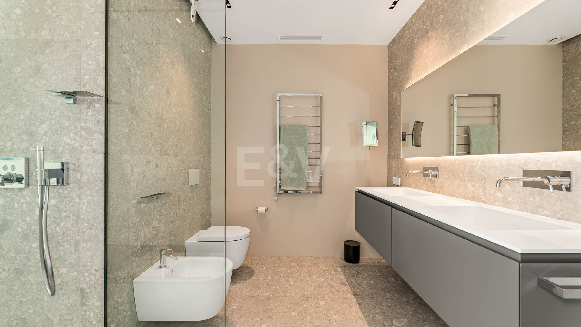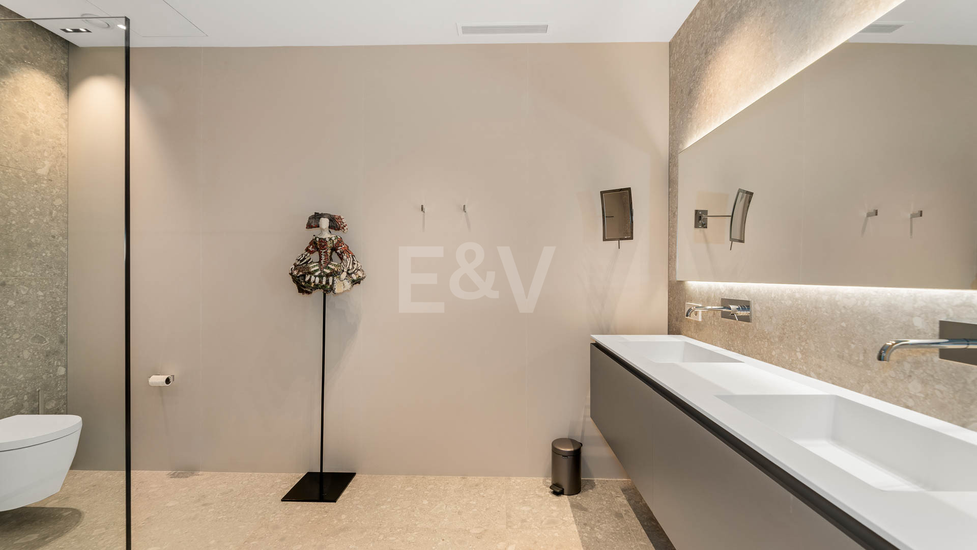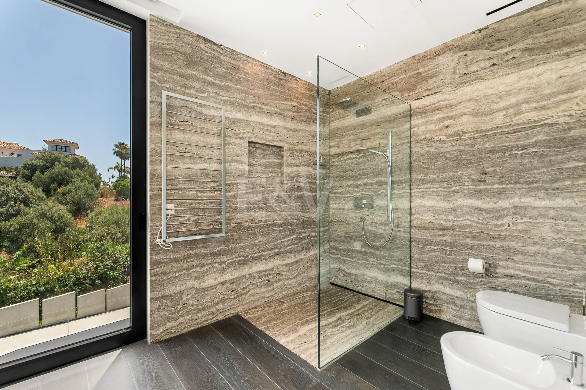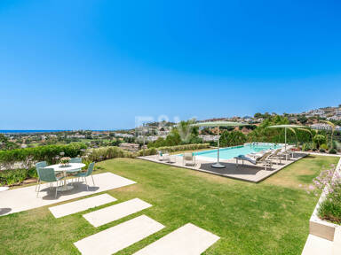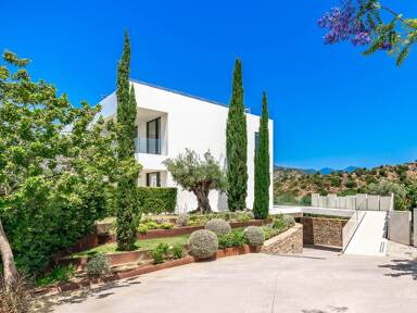 La planta superior está reservada para el descanso. La suite principal corona el nivel superior, abrazando la luz y el volumen a través de ventanas de cristal de altura completa que enmarcan vistas ininterrumpidas del valle del golf y la resplandeciente costa más allá. Un refinado vestidor con exposición estilo boutique y estanterías retroiluminadas conduce a un santuario de baño con una bañera independiente perfectamente situada para contemplar el Mediterráneo. Salga a una amplia terraza privada con ducha al aire libre, un oasis bañado por el sol para rituales matutinos tranquilos o el reposo al atardecer.