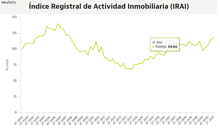 Selon l’indice d’activité des registres immobiliers (IRAI) élaboré par l’Association des Registres, dont l’objectif est d’analyser l’évolution du secteur tant du côté de la demande (transactions et hypothèques) que du côté de l’offre (activité immobilière commerciale), au deuxième trimestre de cette année, l’activité a grimpé de 20,9 % en glissement annuel pour atteindre 117,8 points, soit le niveau le plus élevé depuis le début de 2008.