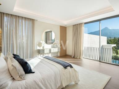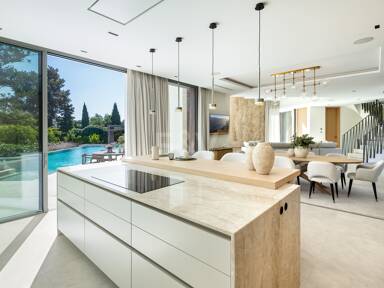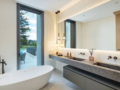 Discrètement intégrée à ce niveau, une buanderie spacieuse est équipée d’appareils Miele haut de gamme et de nombreux rangements intégrés. Les armoires minimalistes et le sous-éclairage ambiant maintiennent l’esthétique cohérente de la villa, transformant les tâches pratiques quotidiennes en une expérience raffinée.