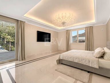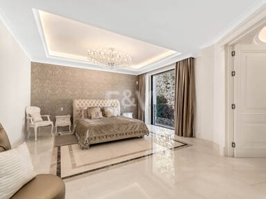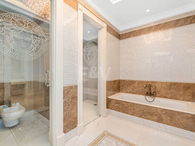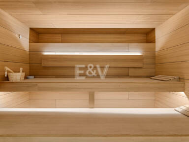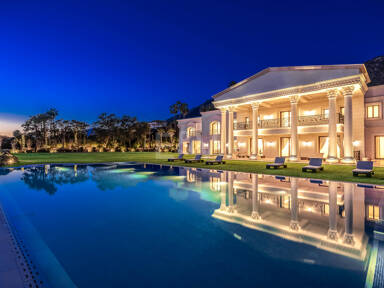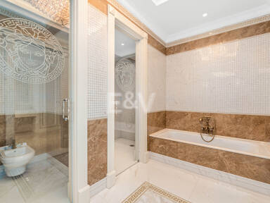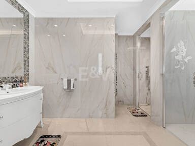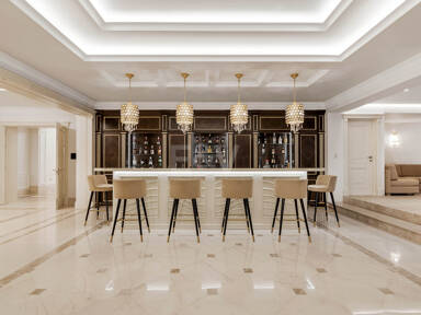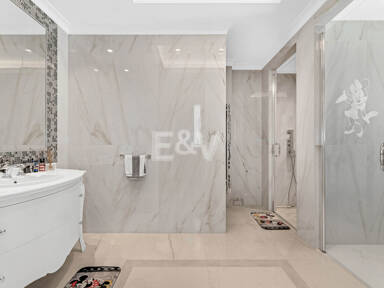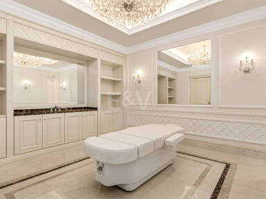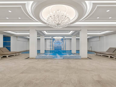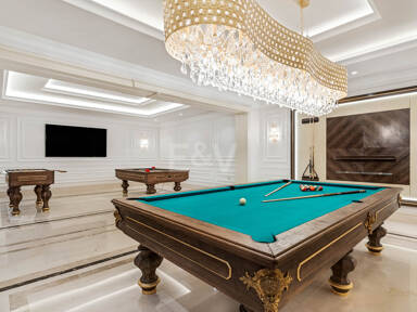 The lower level of Villa Bellagio reveals an extraordinary vision of residential design, a world-class destination of wellness and entertainment. At its core, a meticulously designed spa spans two distinct wings, each crafted with exceptional attention to detail. One wing emerges as a sanctuary of personal rejuvenation, featuring a traditional Hammam, a Finnish sauna, dedicated massage rooms, and an elegant salon for professional hairdressing and manicure services. The opposing wing houses a state-of-the-art gymnasium, designed to inspire peak physical performance with. Every detail has been carefully considered, from the mosaic-tiled indoor heated pool to the professional-grade equipment and luxurious finishes.