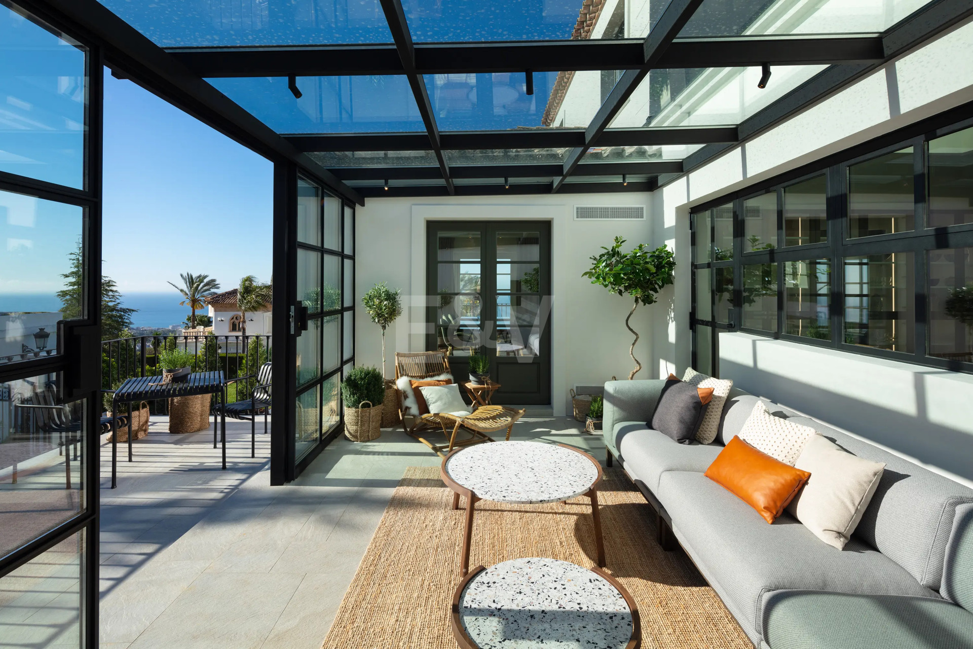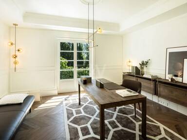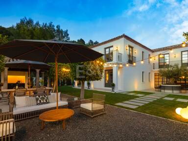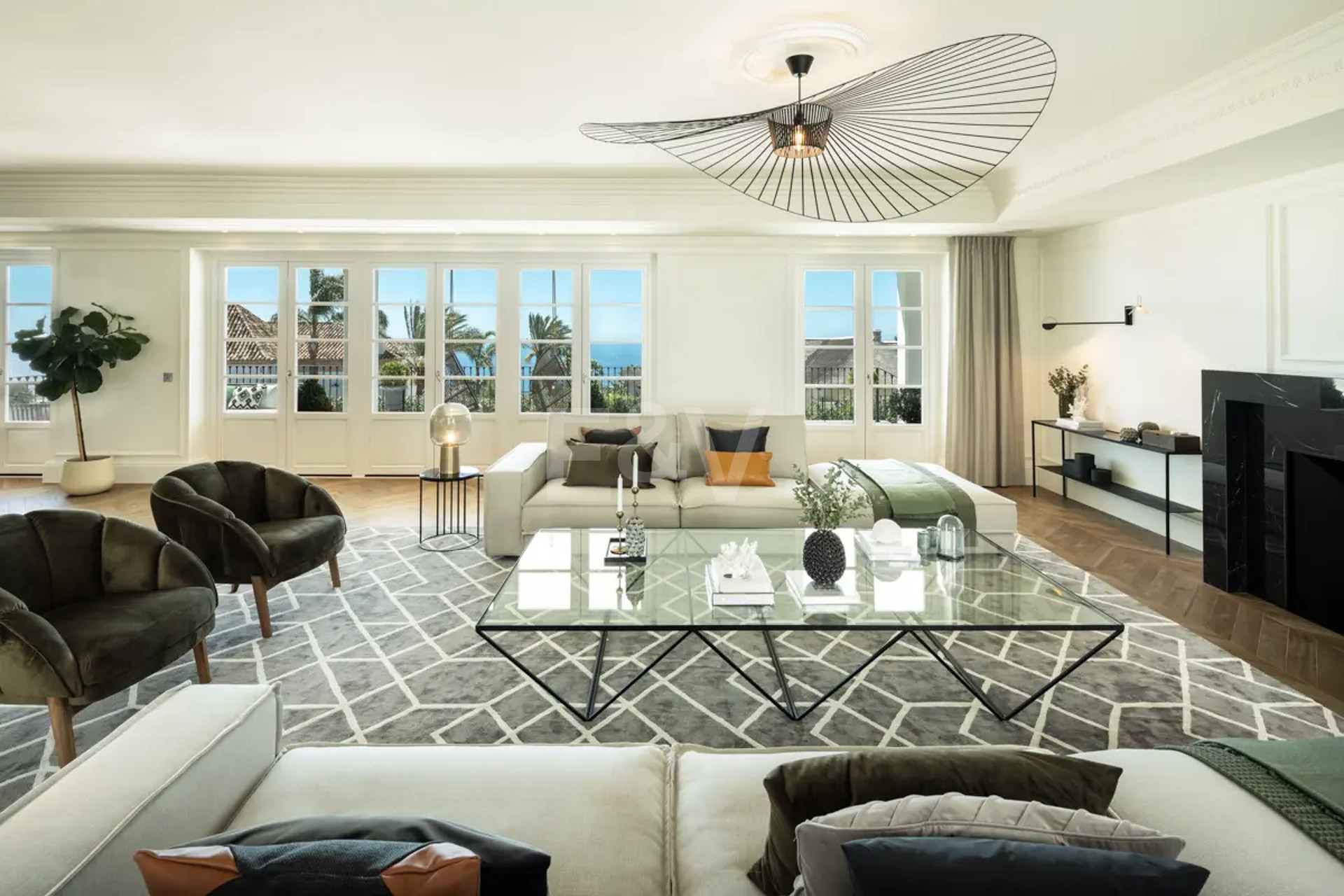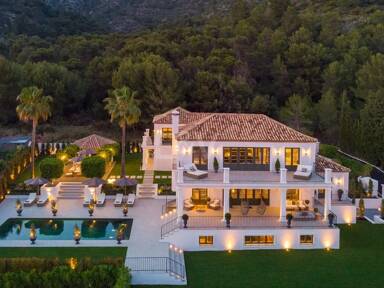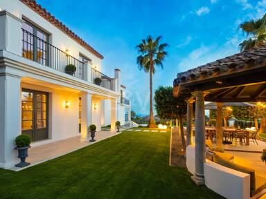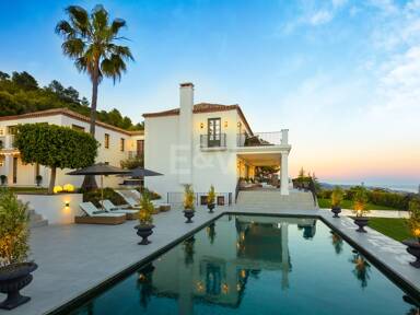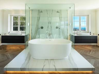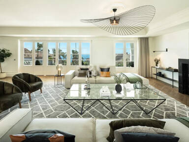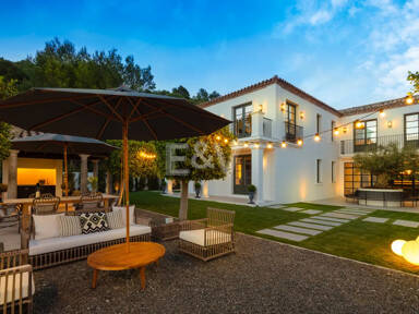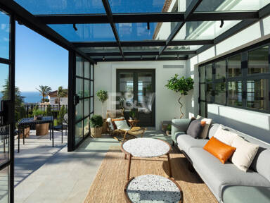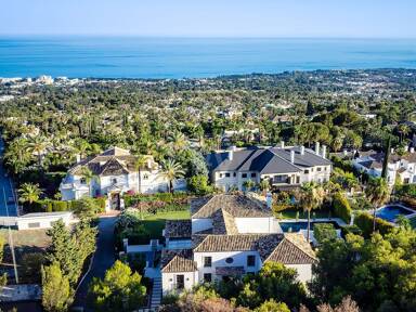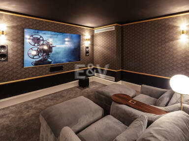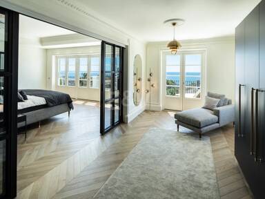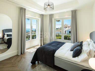 Beyond its exceptional entertaining spaces, the residence is conceived as a private retreat of unparalleled comfort and exclusivity. Six meticulously appointed bedroom suites offer secluded havens, with the primary spaces featuring sweeping coastal vistas and striking marble-finished bathrooms centred around sculptural freestanding tubs. The dedication to an elevated lifestyle is further realised in a comprehensive wellness and leisure realm, comprising a state-of-the-art cinema, private gymnasium, and dedicated spa, while the beautifully curated grounds provide a masterclass in al fresco living, anchored by a striking swimming pool, a sunken fire-pit lounge, and the subtle shade of mature olive trees.