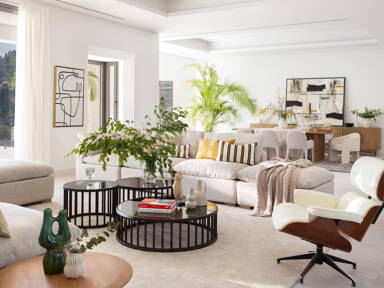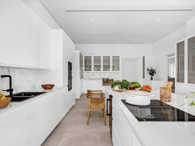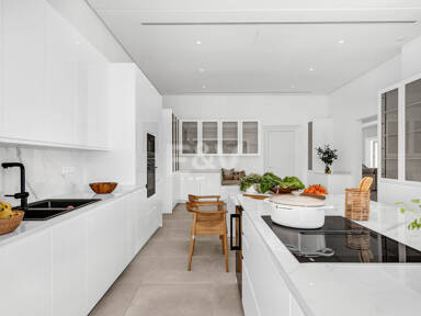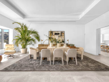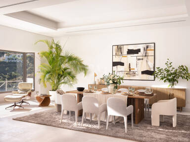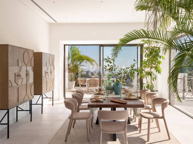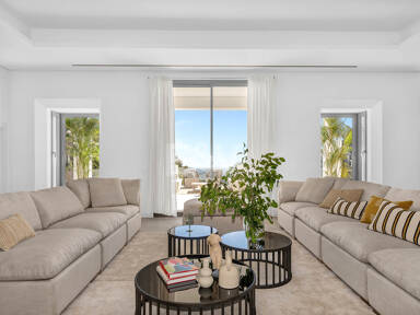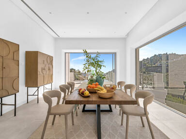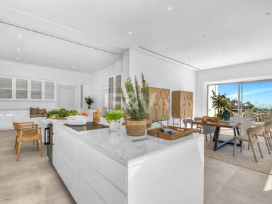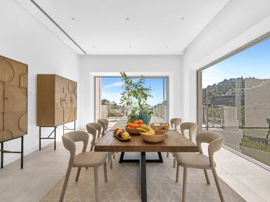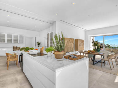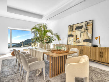 The heart of the home lies in its vast, open-plan living and dining area. Featuring soaring ceilings, large windows, and the finest materials throughout, the space flows effortlessly onto spacious terraces, ensuring that the stunning sea views remain a focal point at all times. The modern, minimalist design enhances the sense of space, while underfloor heating, air conditioning, and state-of-the-art fixtures and fittings ensure absolute comfort. A dedicated lounge and dining area provide a perfect setting for both relaxed family gatherings and more formal entertaining.