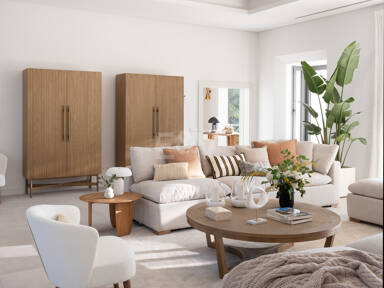 Upstairs, the villa’s private sleeping quarters are found. The master suite is a true sanctuary, featuring a spacious walk-in closet and an en-suite bathroom that exudes luxury. The master suite opens onto a private terrace, offering uninterrupted views of the surrounding landscape. Two further en-suite bedrooms are located at either wing of the upper floor, each offering their own private retreats with elegant bathrooms and ample space.