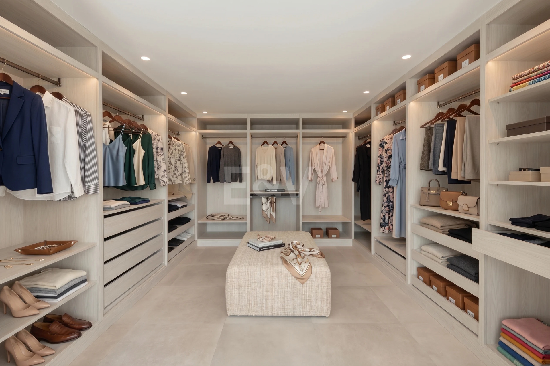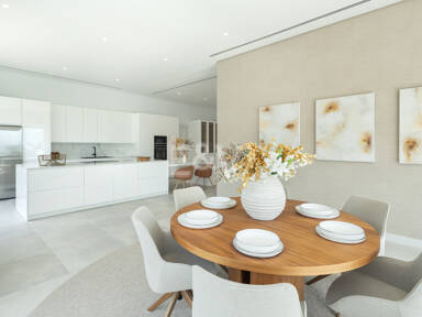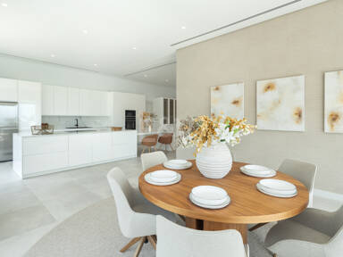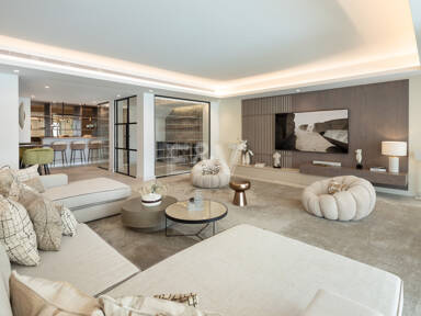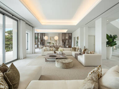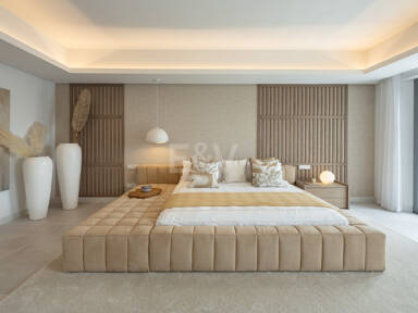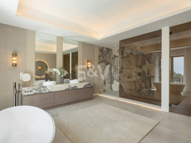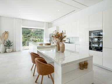 The heart of the home lies in its vast, open-plan living and dining area. Featuring soaring ceilings, large windows, and the finest materials throughout, the space flows effortlessly onto spacious terraces, ensuring that the stunning sea views remain a focal point at all times. The modern, minimalist design enhances the sense of space, while underfloor heating, air conditioning, and state-of-the-art fixtures and fittings ensure absolute comfort. A dedicated lounge and dining area provide a perfect setting for both relaxed family gatherings and more formal entertaining.