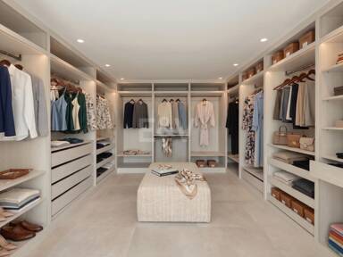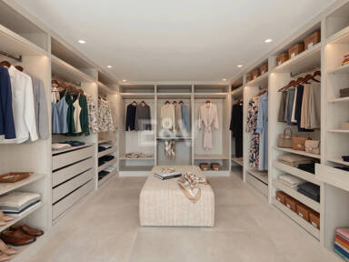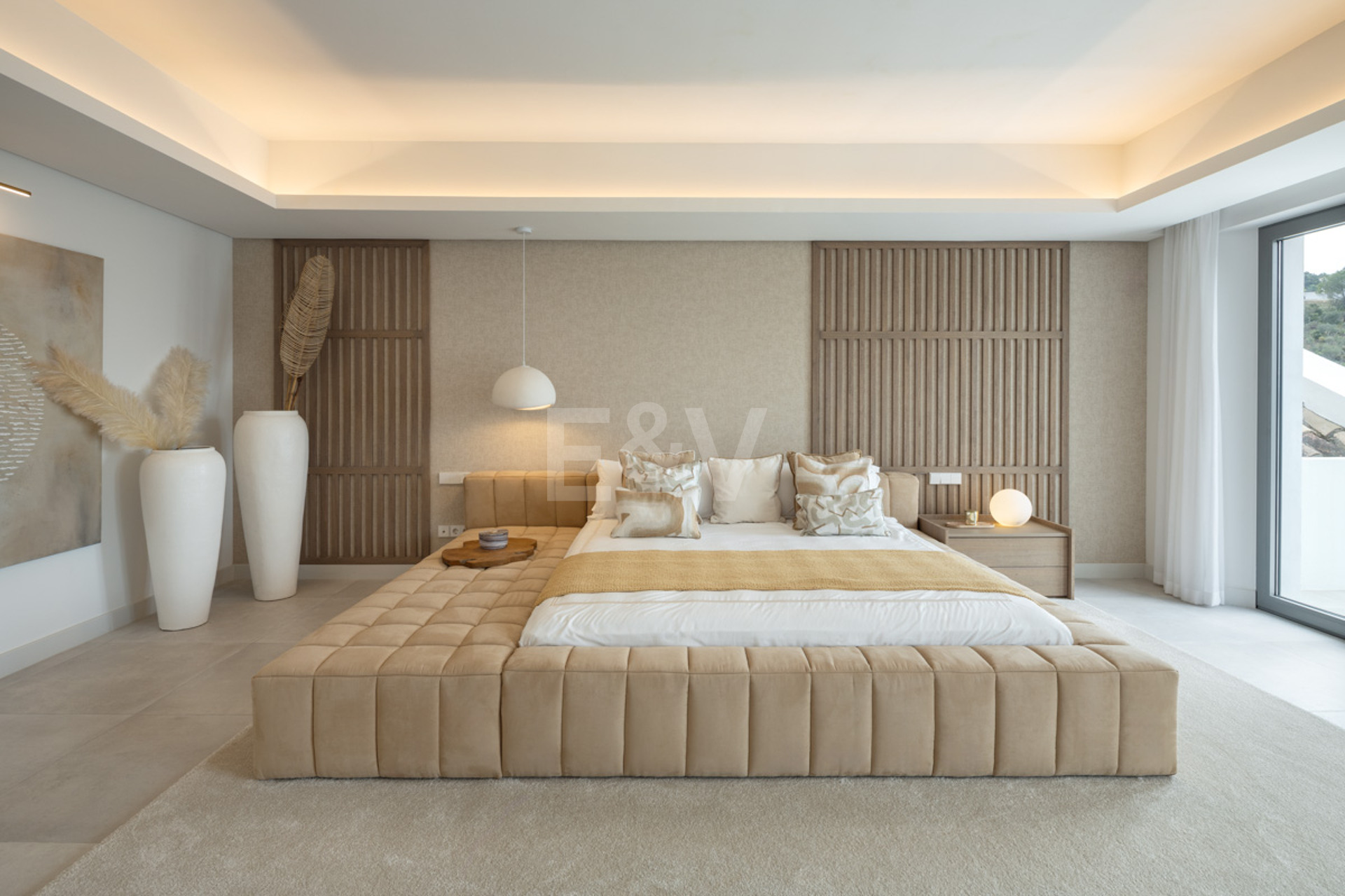 Upstairs, the villa’s private sleeping quarters are found. The master suite is a true sanctuary, featuring a spacious walk-in closet and an en-suite bathroom that exudes luxury. The master suite opens onto a private terrace, offering uninterrupted views of the surrounding landscape. Two further en-suite bedrooms are located at either wing of the upper floor, each offering their own private retreats with elegant bathrooms and ample space.