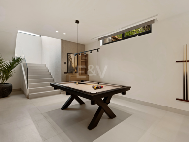 The lower level is dedicated entirely to indulgence. A sleek pool table anchors a contemporary games room, finished with soft lighting and bespoke shelving, creating a relaxed space for casual gatherings. Adjacent to it, the wine bodega offers a refined setting to showcase and enjoy a private collection, with steel-framed glass doors and ambient temperature control adding to the sophistication.