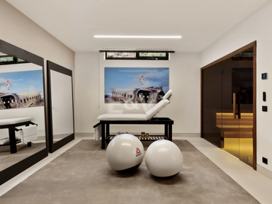 The wellness area invites you to slow down and recharge. A private gym with mirrored walls and natural light offers a peaceful atmosphere for daily fitness, while the adjoining massage room provides a haven of calm. Finished in warm woods and textured neutrals, the adjoining sauna elevates the wellness ritual into a private spa experience.