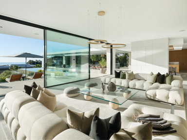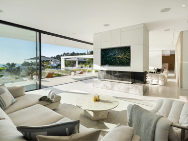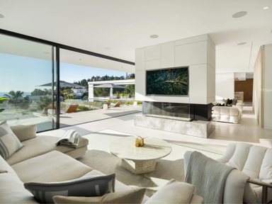 As you approach the villa, you are greeted by the striking exterior that embodies modern architectural brilliance. The property seamlessly integrates with its surroundings, offering a contemporary design that is both visually captivating and harmonious with nature. Upon entering, the grand entranceway welcomes you with its sweeping open space and clean lines, leading to an expansive, open-plan living area. The villa’s design embraces natural light, with expansive floor-to-ceiling windows framing panoramic views of the Mediterranean and mountains beyond, creating a continuous connection with the outside world. The contemporary fireplace adds a touch of warmth, making the living room an inviting space to relax or entertain.