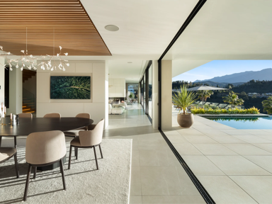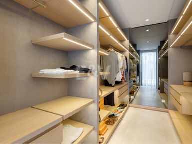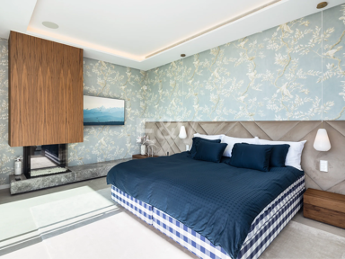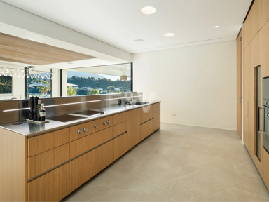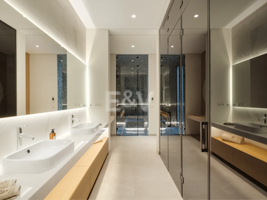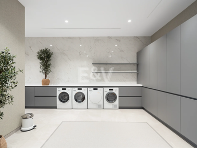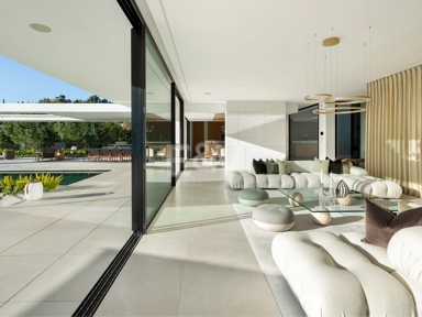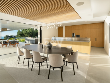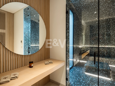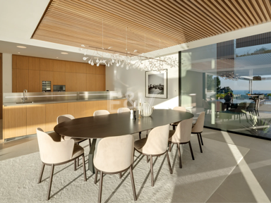 The heart of the home is the state-of-the-art Gaggenau kitchen, which flows effortlessly into the dining and living areas. The kitchen is fully equipped with the latest appliances, providing everything needed for culinary exploration. The open-plan design encourages a seamless flow between spaces, ensuring that the kitchen, dining, and living areas feel connected and spacious. High ceilings throughout the villa enhance the sense of airiness, while the carefully chosen materials reflect the home’s commitment to quality and style.