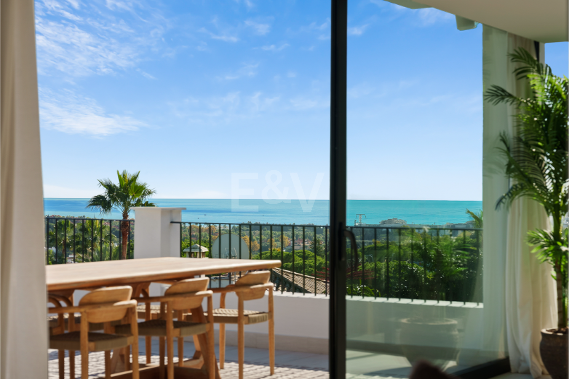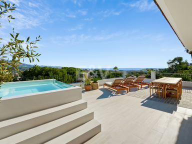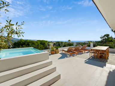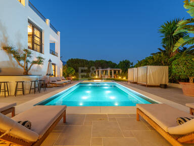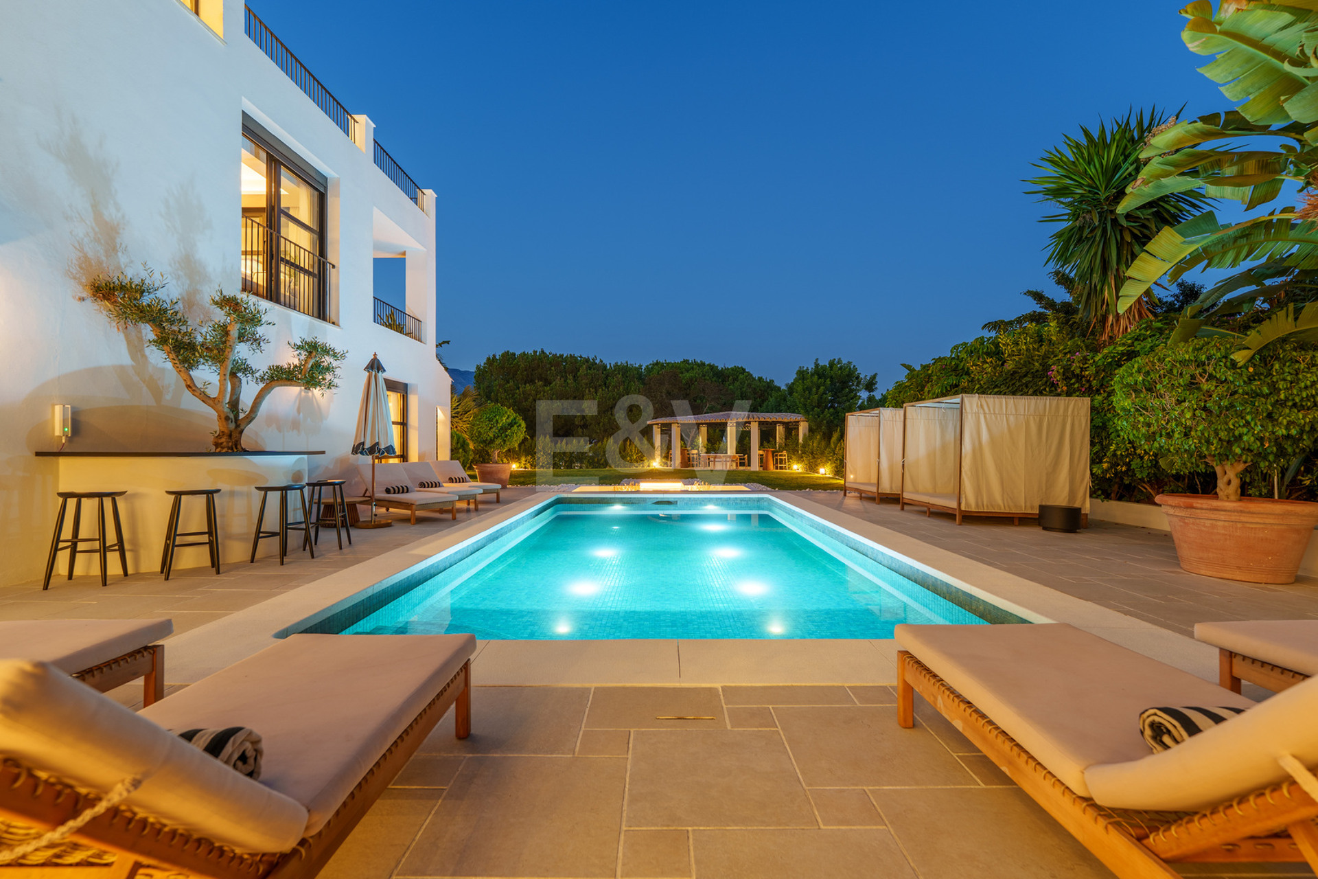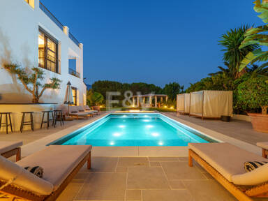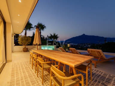 Outside, the landscaping is designed as a soft architectural frame around the pool, with shaded seating, a sunken lounge, and gentle lighting that extends the atmosphere into the evening. Multiple covered terraces provide flexibility across the day, while a private garage for several vehicles completes a residence that feels both considered and effortlessly liveable in the heart of Nueva Andalucía.