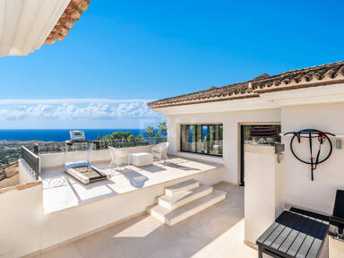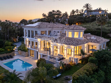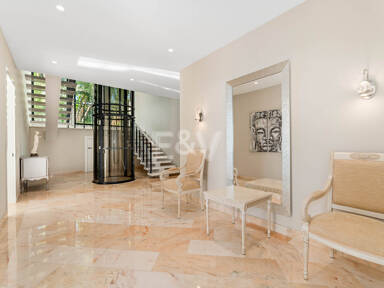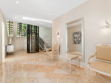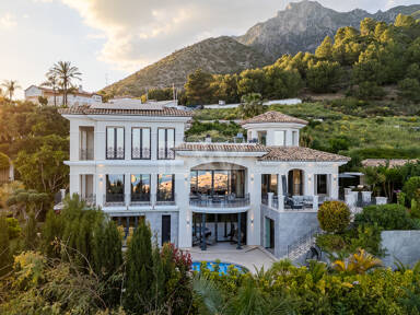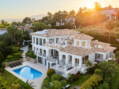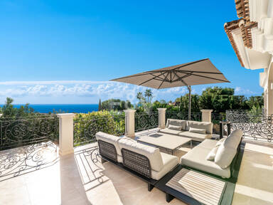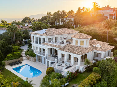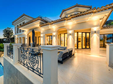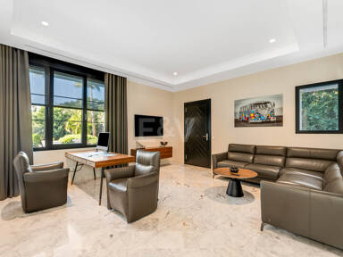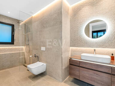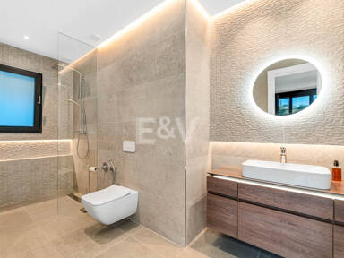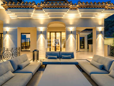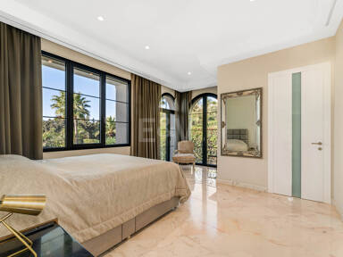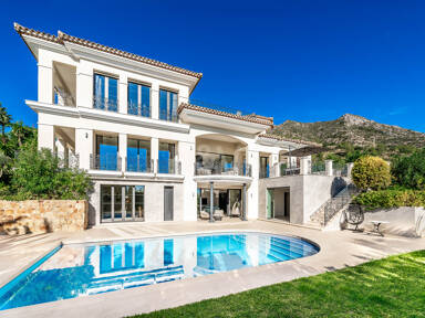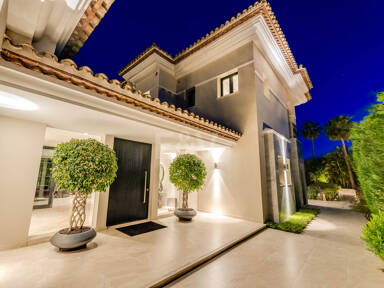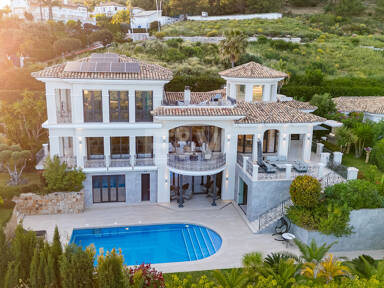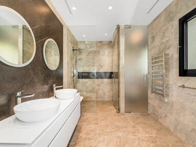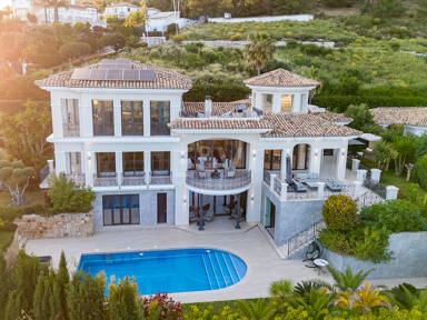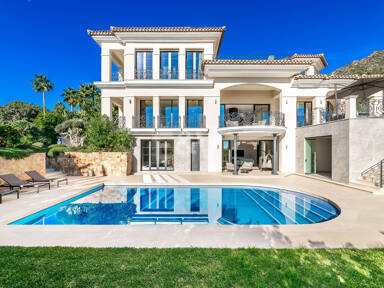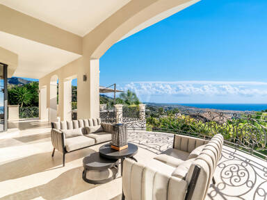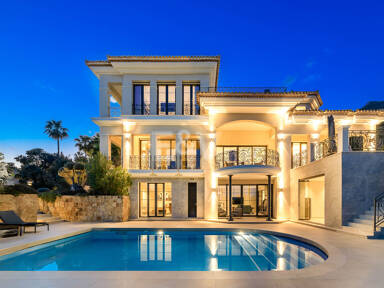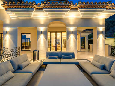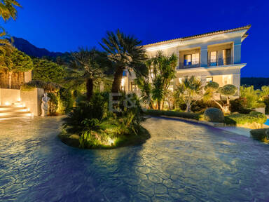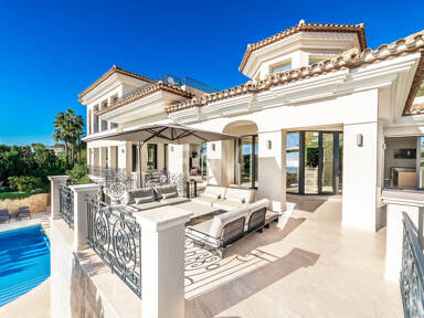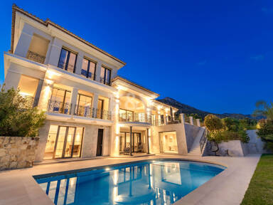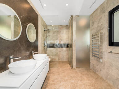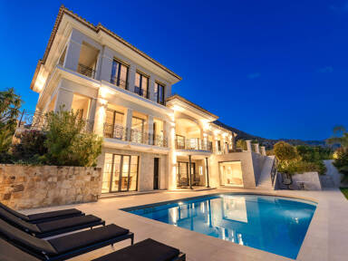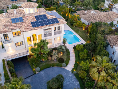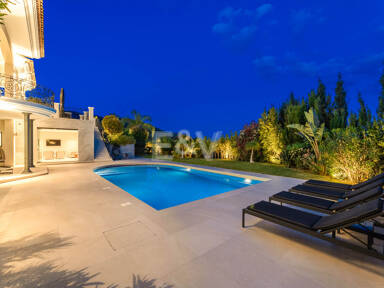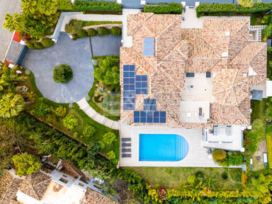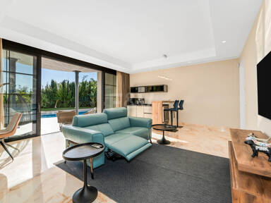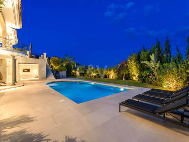 Obszary zewnętrzne willi zostały zaprojektowane z myślą zarówno o spokoju, jak i świętowaniu. Duży basen stanowi kotwicę ogrodu krajobrazowego, otoczonego eleganckimi tarasami i dojrzałą zielenią.
