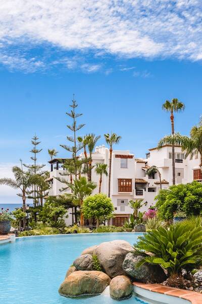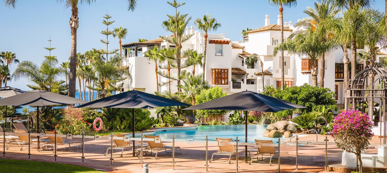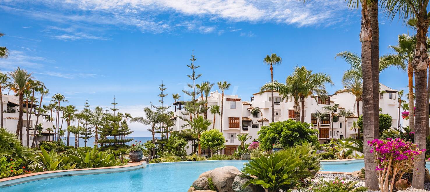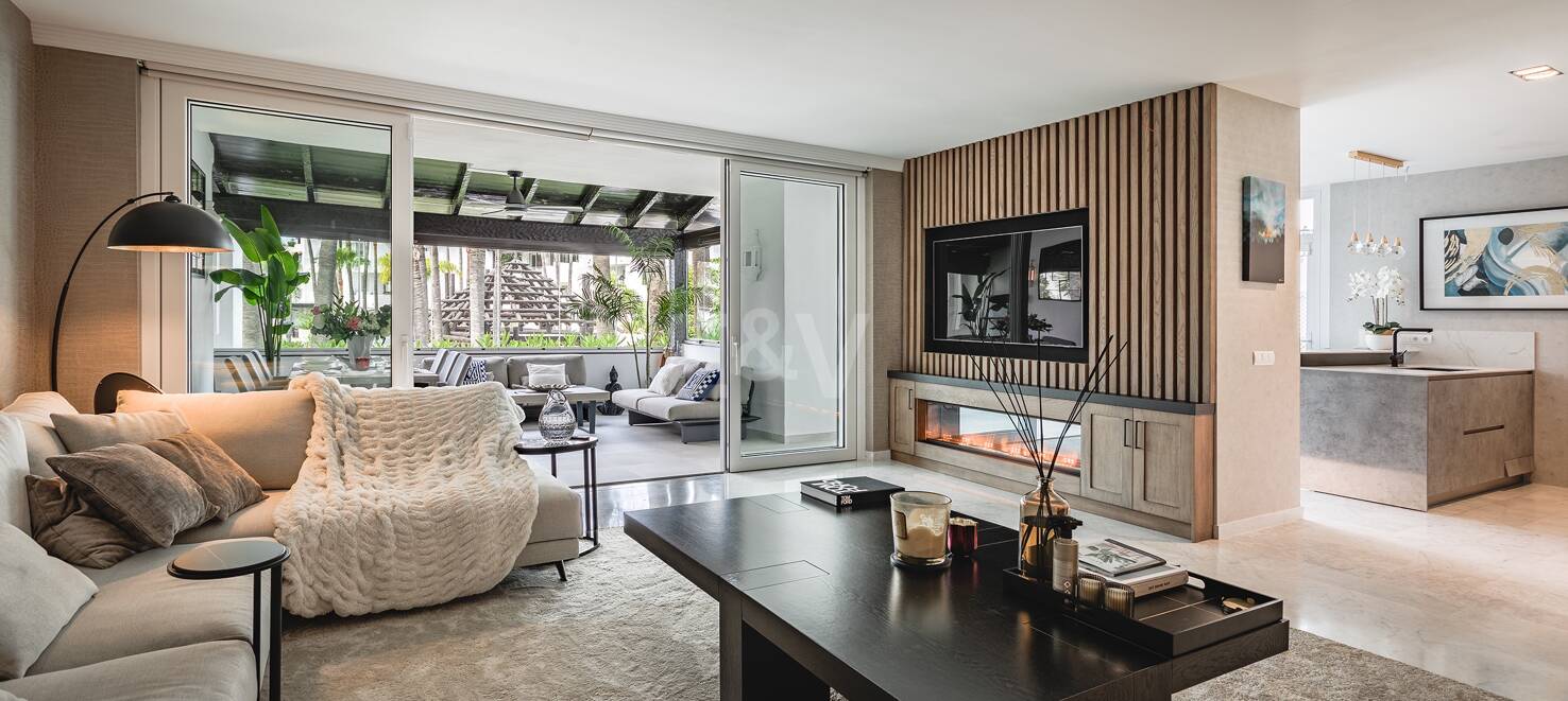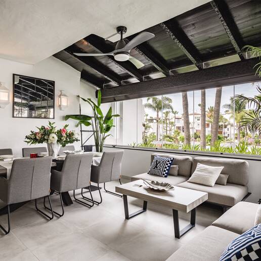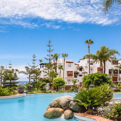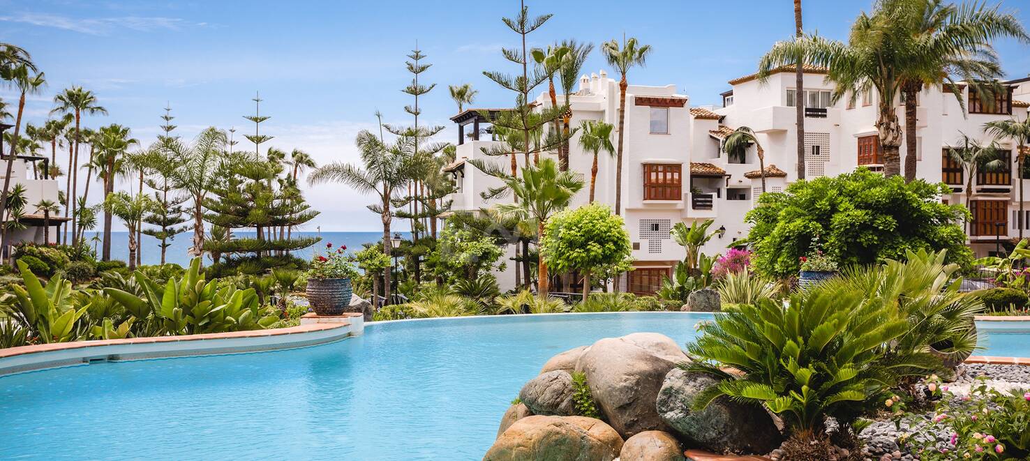 This singular, fully renovated southwest-facing apartment, located in the prestigious beachfront complex of Japanese Gardens, Marina Puente Romano, offers the perfect balance of refined luxury, privacy and comfort.