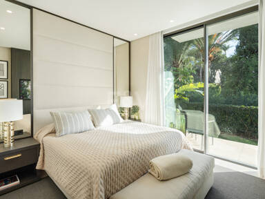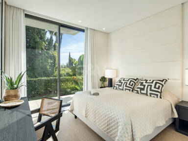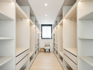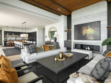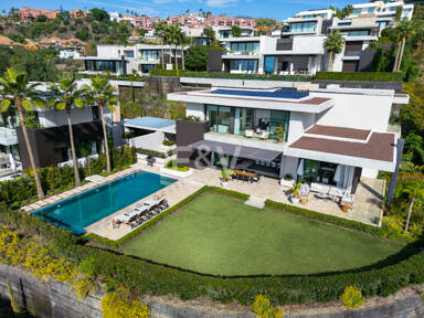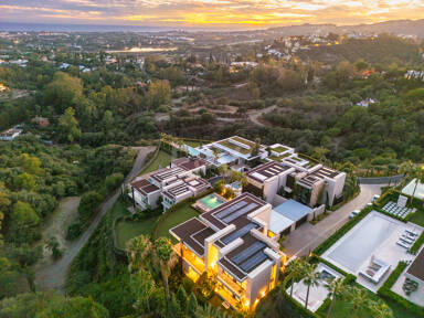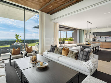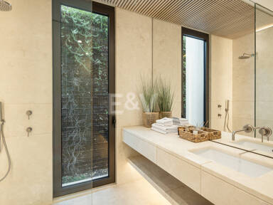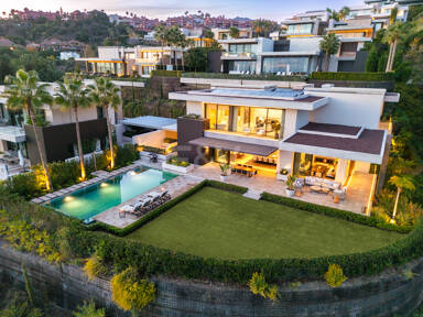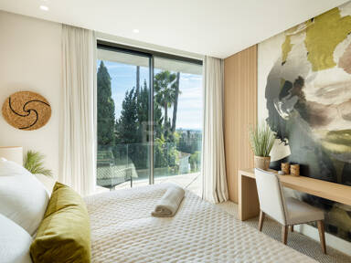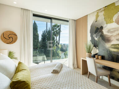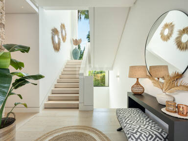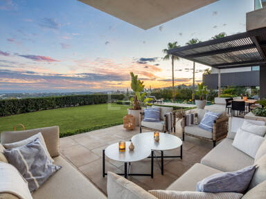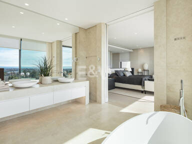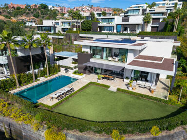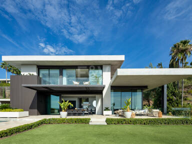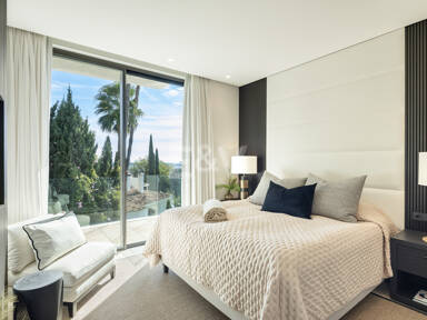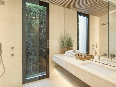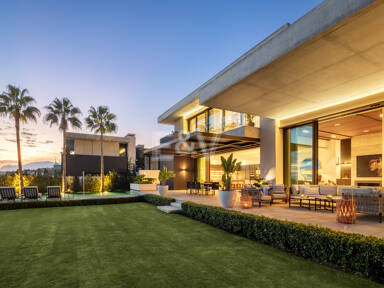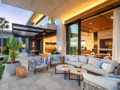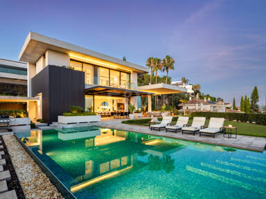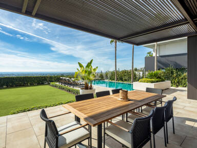 När man går ut fortsätter livsstilen under bar himmel. Expansiva terrasser flyter från de viktigaste vardagsrummen och smälter enkelt samman med de frodiga trädgårdarna och panoramautsikten över havet. Oavsett om du kopplar av vid poolen på designade solstolar, njuter av uteservering under pergolan eller varvar ner med en drink när solen sjunker under horisonten, är varje ögonblick upphöjt av villans uppmärksamhet på detaljer, material och oklanderlig känsla av plats.